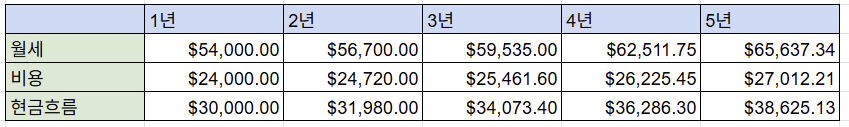 A라는 사람은 빈 땅이 있어서 건물을 세워보려고 계획을 합니다. 작은 3층짜리 건물을 계획했고, 여러 부동산 주변 시세를 돌아보니 1층은 $2,000 2층은 $1,500 3층은 $1,000 의 월세를 받을 수 있을 것으로 계산이 됩니다. 그러나 건축비를 제외하더라도 미래에 꾸준히 벌 수 있는 돈에 대해서 계산을 해보고 싶어서 3층짜리 건물 유지할 때 필요한 비용들이 무엇인지에 대해서 알아봅니다. 청소, 경비, 시설점검, 엘리베이터 안전 점검, 소방 안전, 방역 등 각종 비용들이 나갈 것으로 예상해 본 결과 월 $2,000달러는 비용으로 나갈 것을 예상해야 할 듯합니다. 그렇다면 미래에 해마다 받을 수 있는 현금흐름은 얼마일까요? 이 예시에서는 달마다 $2,500 현금흐름 창출이 될 것으로 예상되며 매년 $30,000의 현금흐름이 예측됩니다.